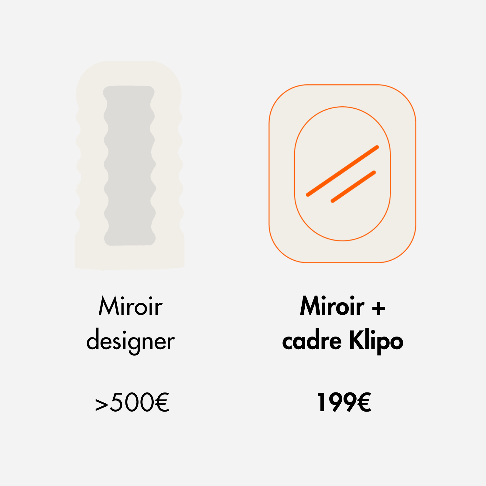 Le miroir a cadres interchangeables Klipo est 2 à 3 fois moins cher que des miroirs de designer (Prix moyen constaté pour des pièces de designer)